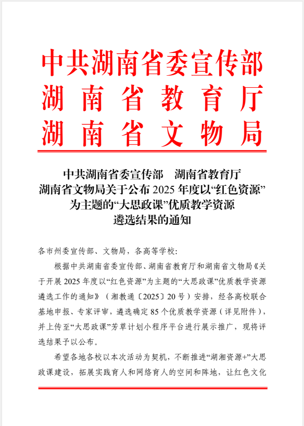 此次优质教学资源遴选面向全省各高校及红色教育基地联合申报,经专家评审,最终确定85个入选项目。我院两项成果同时突围,既彰显了学院在“大思政课”建设领域的系统布局与创新实践,也体现了对湖湘红色资源的深度挖掘与活化运用。