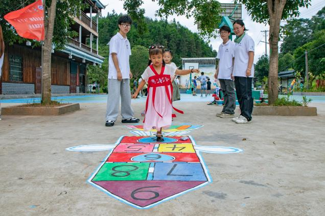 别开生面的“美育+体育”暑期“三下乡”社会实践活动如火如荼地展开,吸引了留乡侗族青少年的热情参与。活动通过“画房子”“跳房子”的趣味活动,用小朋友们喜爱的绘画方式将“房子”进行填色,在进行团队协作的同时,使小朋友对心中的“家园”有了美好的向往,也进一步提升了美育素养。在“跳房子”环节设置了传递沙包的口令,目的在于增强青少年间的信任感,达到携手共建美好家园的心理建设,这一过程不仅锻炼体魄,更进一步促进了侗乡青少年之间的友谊。