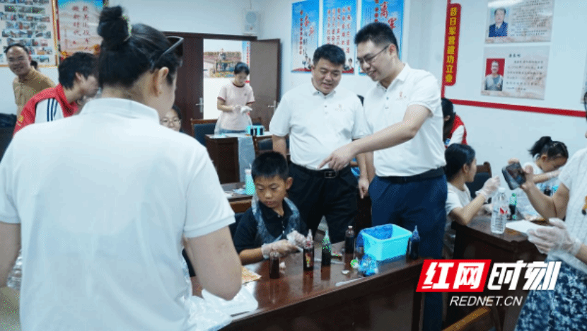 在非遗扎染体验课上,志愿者化身专业讲师,拆解扎染的经典技法,手把手教孩子们完成布料的折叠、捆扎、浸染等步骤。孩子们全心投入创作,收获了一件件图案独特的扎染作品。