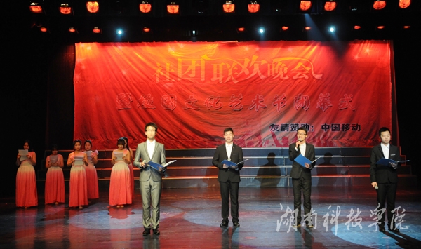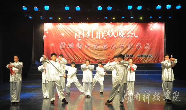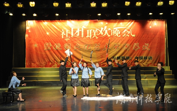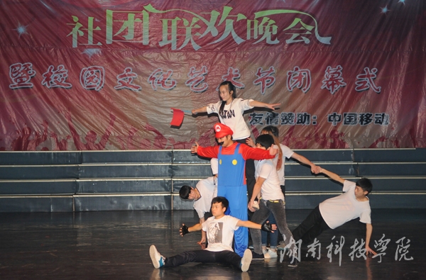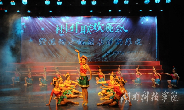 晚会在社团宣传片中拉开帷幕。轻快的旋律,动力十足的舞蹈《La song》迅速点燃全场气氛;由播音主持协会带来的《滑板鞋》以网络疯传的《我的滑板鞋》为背景音乐,优美的舞蹈与声情并茂的朗诵完美结合,以及略带诙谐的动作,赢得了观众的呐喊和震耳欲聋的掌声,一度把现场的气氛推向高潮;由绿色潇湘环保协会,秘书协会和伟德志愿者协会合作的《T台秀》,将旧报纸,塑料袋等废弃物品做成的服装,或优雅大方,或粉妆玉琢,各种不同风格的服饰让同学们眼前一亮,真正做到了变废为宝;身着汉服的潇湘七兮汉服社为我们带来了舞台剧《烈烈衣冠·血色汉魂》,慷慨激昂、生动到位的表演,为我们展现了“宁为玉碎,不为瓦全”的古汉人的忠贞;风荷艺术团带来的哑剧《黄河大合唱》,夸张滑稽的动作,生动形象的表演引得现场掌声连连,笑声不断;街舞协会带来的街舞《童年的马里奥》,用马里奥救公主的故事诠释了英勇执着,动感的舞蹈,欢快的旋律给观众强烈的视觉冲击;雅韵陶笛社的乐器演奏《永远思念的故土》则唯美悦耳、宛转悠扬,为大家奉献了精彩的视听盛宴。空手道协会则以剑,棍,等传统武器向同学们展示了中国传统武术的魅力。