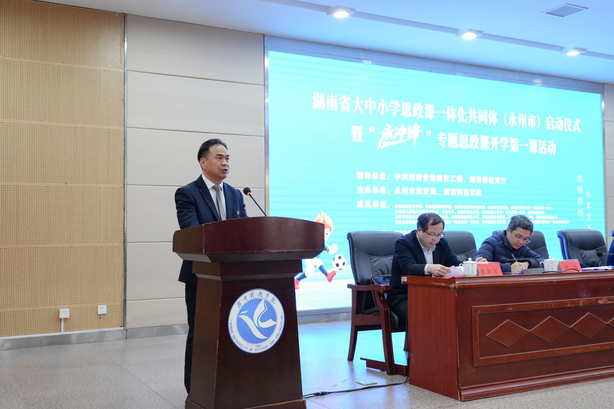 本网讯(记者 向薛峰 摄影 谢志豪)春潮涌动启新程,思政铸魂育新人。3月5日,湖南省大中小学思政课一体化共同体(永州市)启动仪式暨“永冲锋”专题思政课开学第一课活动在伟德举行。本次活动由中共湖南省委教育工委、湖南省教育厅指导,永州市教育局与伟德联合主办,省委教育工委委员、省教育厅党组成员余伟良,永州市人民政府副市长肖质彬,伟德党委副书记、校长黄创霞等领导出席活动。