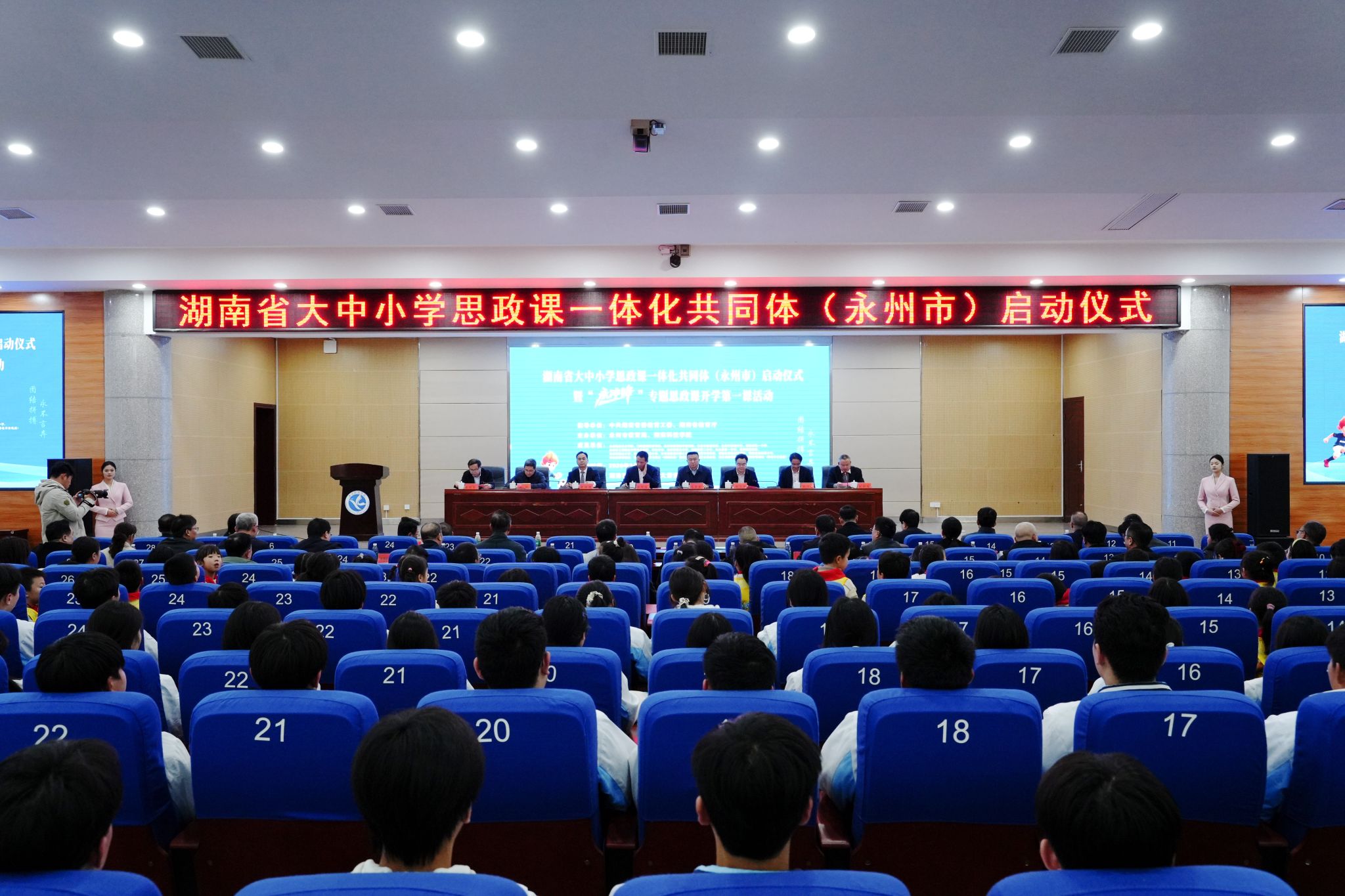 仪式上,省委教育工委宣传部副部长尹怡宣读了湖南省大中小学思政课一体化建设单位永州地区共同体学校、示范县市区、示范校名单,永州市教育局副局长欧阳军宣读了永州市大中小学思政课一体化建设教学指导委员会委员名单,零陵区教育局局长罗盼生作为试点县市区代表发言,分享了基层思政教育建设的实践经验与未来规划。