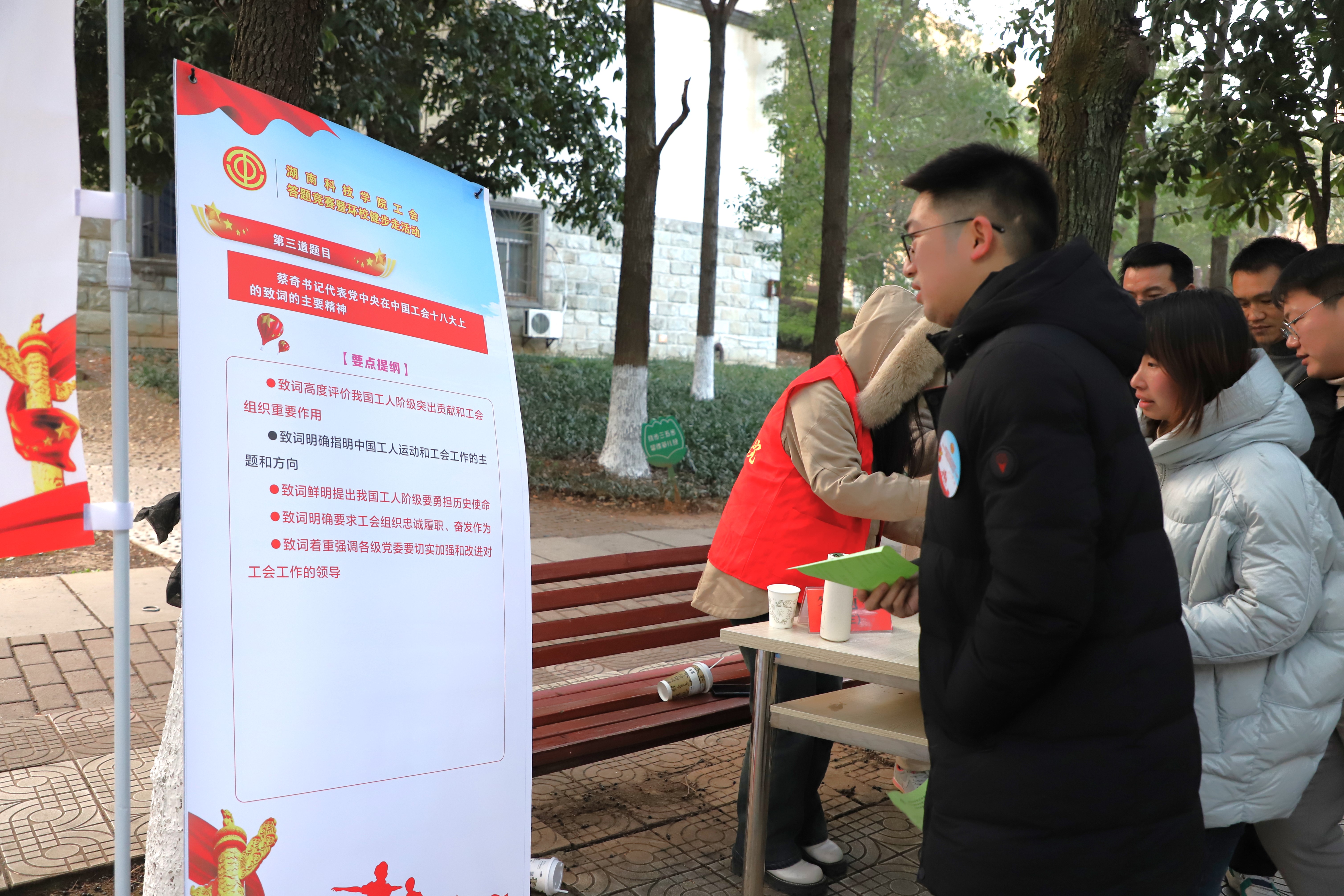 当天,还开展了环校健步走活动,100 余名教职员工参与,刘湘凌宣布活动开始。活动现场还设置了答题环节,为环校健步走增添了趣味性。参加健步的选手迈开步伐、争先恐后,热情高涨,精神抖擞,宛如一条游动的长龙行进在美丽的校园,成为这个冬日最亮丽的风景线。