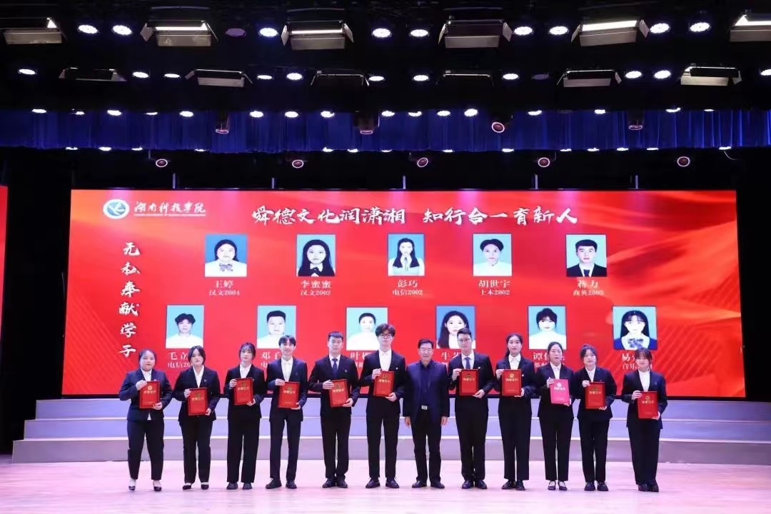 本网讯(记者 刘思哲 曾紫然)舜德文化润潇湘,知行合一育新人。11月11日,学校举行2023年舜德学子颁奖典礼,100名优秀学子获表彰。湖南省政协文教卫体和文史委员会副主任、校原党委书记陈建民,党委副书记宋宏福,党委委员、副校长吴小林,党委委员、纪委书记陈灿军出席典礼。