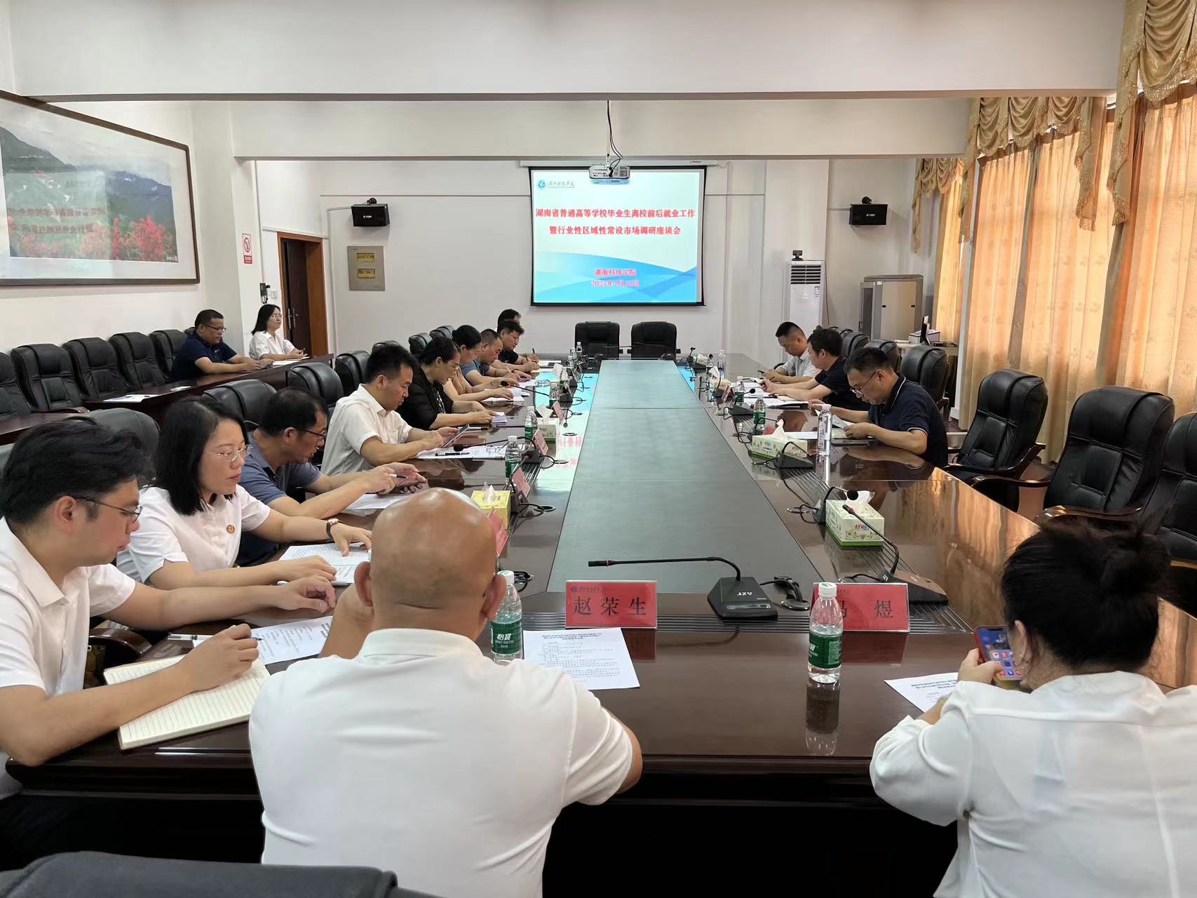 郑银芳介绍学校的基本情况。招生就业与创新创业指导处处长胡清华介绍了常设市场建设情况和2023届毕业生就业工作开展情况。永州职业技术学院、湖南九嶷职业学院、永州师范高等专科学校就业部门负责人介绍了该校2023届毕业生就业开展情况。