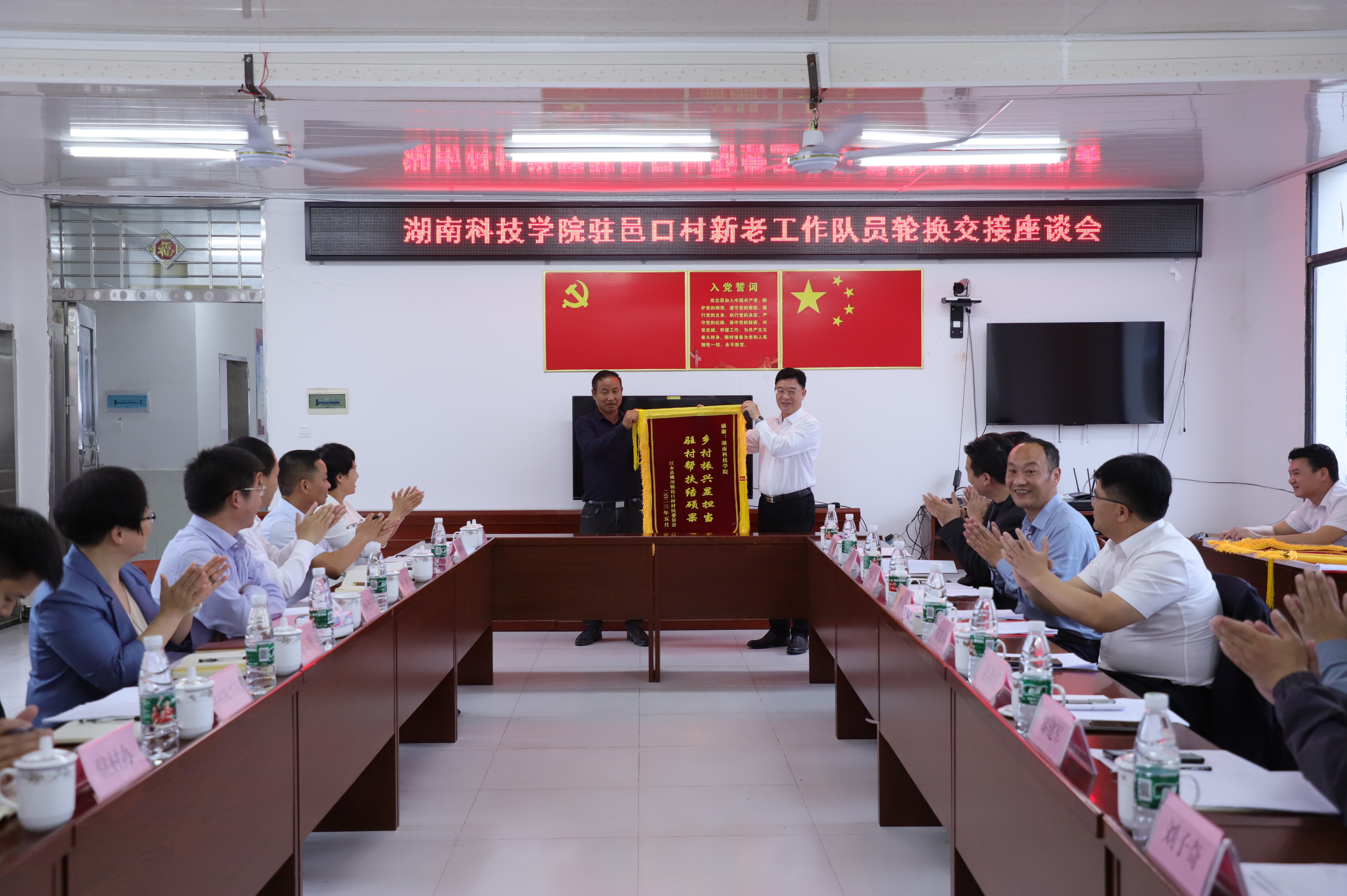 邑口村村支书尹胜飞代表邑口村村支“两委”赠送学校及第一轮驻村工作队锦旗,宋宏福与第一轮驻村工作队接旗。随后,伟德源自英国1946向邑口村捐赠了乡村振兴项目资金。