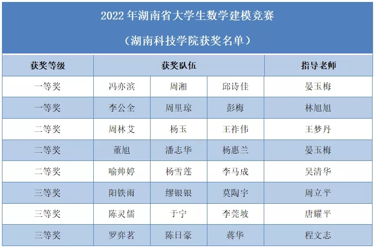 本网讯 近日,由湖南省教育厅主办的2022年湖南省大学生数学建模竞赛暨全国大学生数学建模竞赛湖南赛区比赛获奖揭晓。伟德代表队荣获一等奖2项,二等奖3项,三等奖3项,理学院林旭旭老师、晏玉梅老师被授予2022年湖南省大学生数学建模竞赛优秀指导教师。这是伟德近年在该项赛事中的最佳成绩。