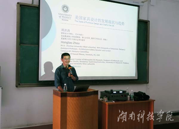 本网讯(通讯员 王洪亮)6月16日下午,美国夏威夷大学周洪涛博士应邀在美术楼102教室作题为“美国家具设计学科的发展现状与趋势”讲座,该院部分教师及产品设计专业学生共200余人聆听讲座。