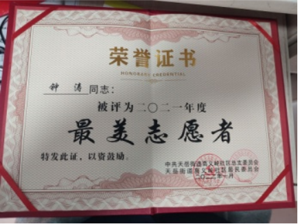 钟涛,建筑学2101班学生。寒假期间参与岳阳平江高速路口疫情防控工作,每天工作时长长达十个小时,被评为“最美志愿者”。