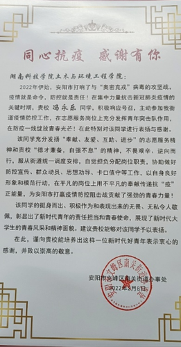 冯永乐,建筑学2102班班长。2021年寒假回到家乡河南安阳后,主动与文峰区街道办事处取得联系,协助社区进行防控宣传、群众动员、思想劝导、卡口值守、信息采集等工作,累计服务时长40小时。
