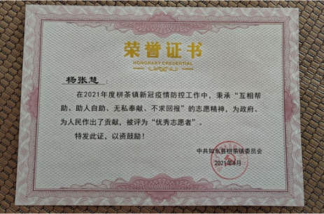 杨张慧,测绘工程2102班学生。在家乡如东县疫情防控工作中负责体温检测工作。她不畏严寒,始终坚守在岗位上,她的工作得到如东县耕茶镇工作人员的充分肯定。