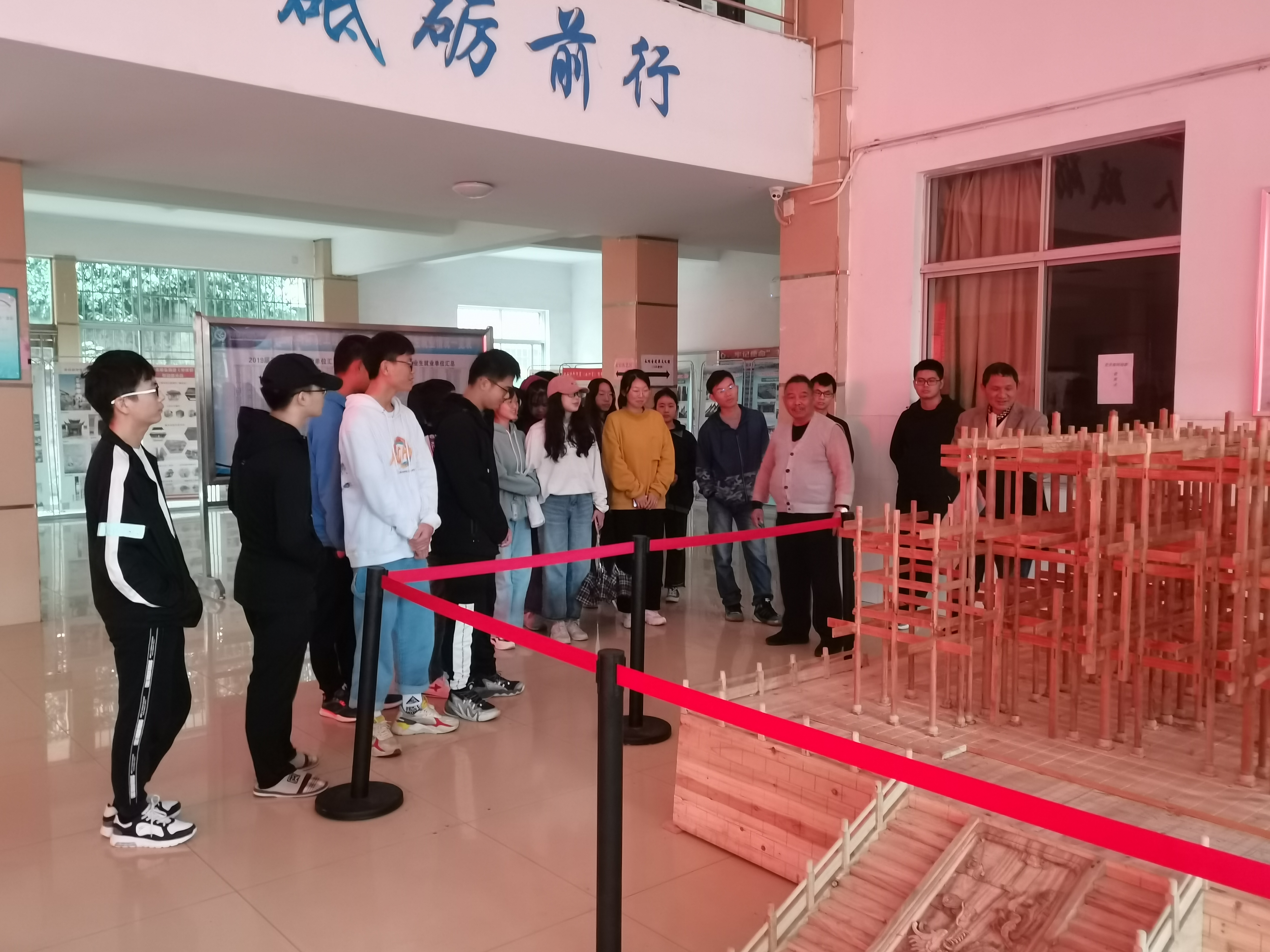 文林将古建保护、修缮案例与建筑专业术语相结合,深入浅出地介绍了建造湘南传统建筑所使用的传统技术,现场演示了制作榫卯结构木工技巧。随后他以零陵古城标志性建筑镇永楼为例,带领学生观摩了逸夫楼一楼大厅的镇永楼模型,分析湘南古建的营造要点。