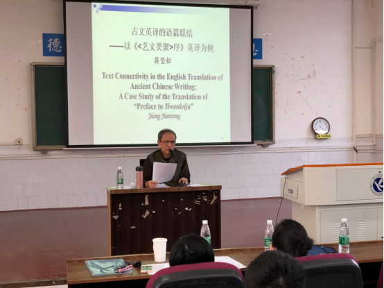 2020年11月6日,应外国语学院邀请,我国著名典籍翻译专家、中国译协资深翻译家、湖南师范大学博士生导师蒋坚松教授在博雅楼东三教室举行了题为“古文英译的语篇联结”的学术讲座。