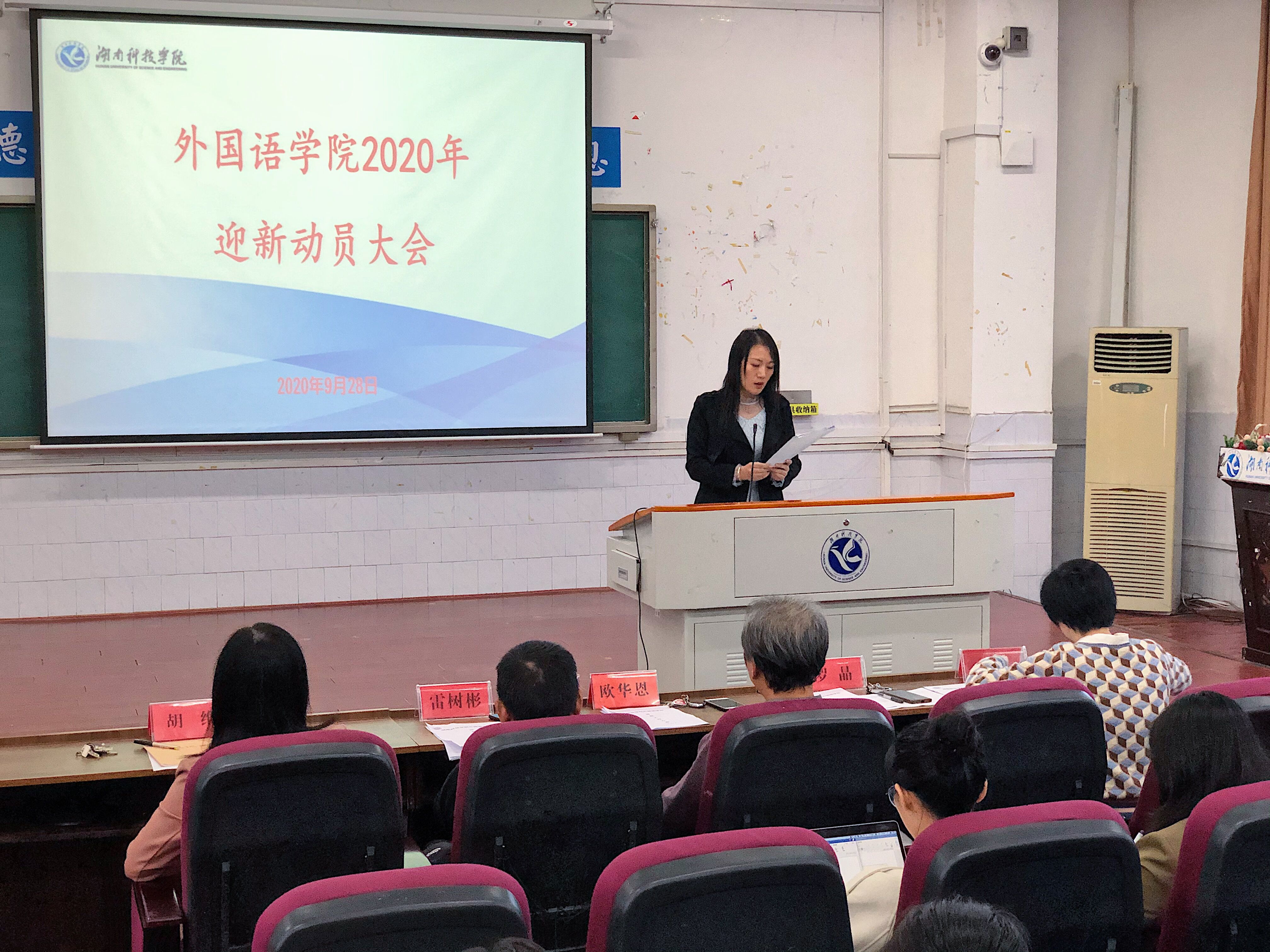本网讯(通讯员 王燕)外国语学院9月28日下午17:00在博雅楼东三举行了2020年迎新动员大会。外国语学院院长欧华恩、党总支书记雷树彬、总支部副书记罗晶、副院长何丽萍、胡维;全体辅导员、新生班主任老师以及全体迎新志愿者到场参与会议。会议由学工办副主任刘罗主持。