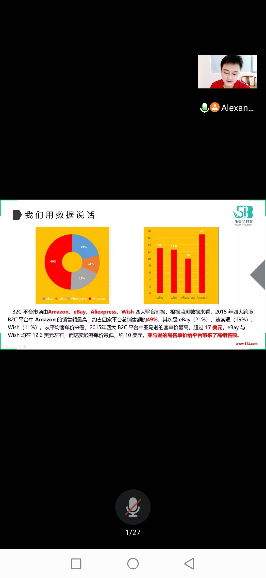 经理主要以下三个方面进行详细介绍:跨境电商概况、渔人计划、学院展示。他对跨境电商的历史、优势等结合详实数据进行讲解,重点强调了亚马逊在中国电商行业的良好前景,以及对相关专业学生今后的就业方向做了详细说明。“渔人计划”是深圳513电商学院的人才培养计划,周经理就其中的项目流程、专业要求、课程大纲等做了说明。学院展示环节则是就深圳513电商学院的核心人员、实战演练、人才招聘、学院活动、学院容貌、岗位薪资等内容做了展示。