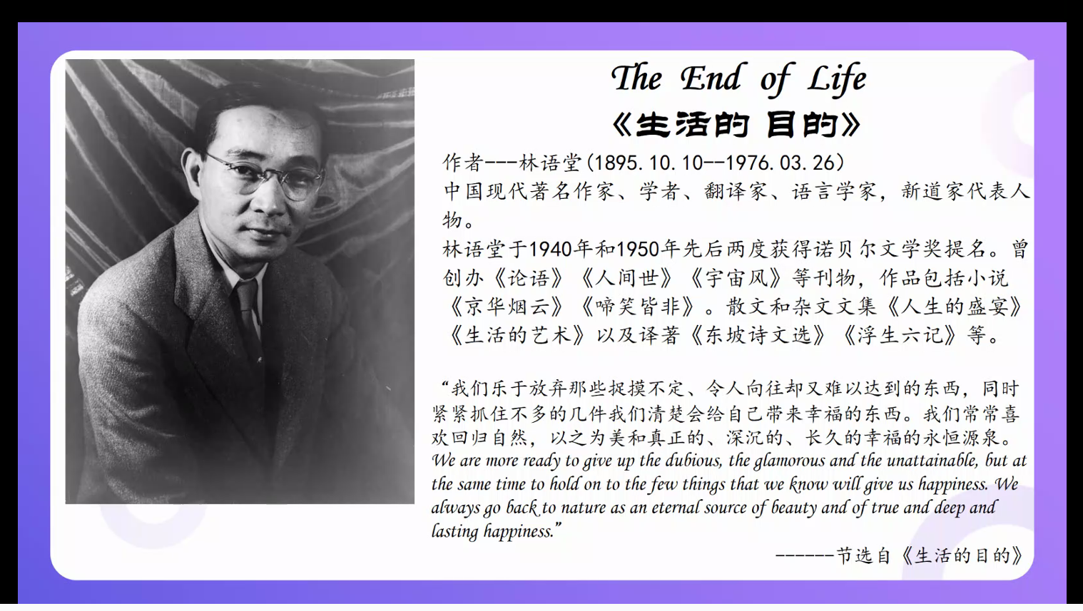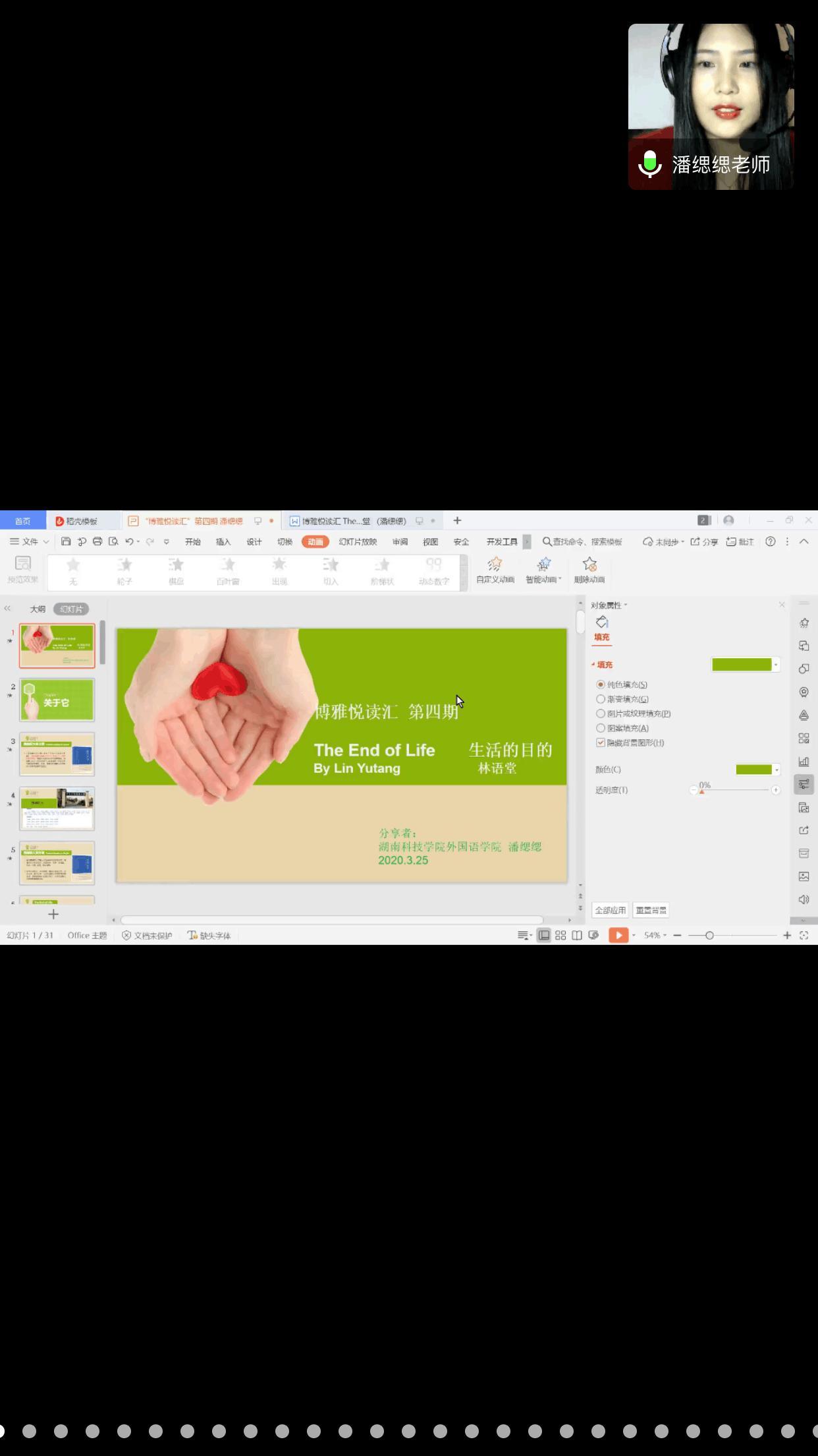 本次悦读汇邀请到的分享嘉宾是外国语学院专任教师潘缌缌,她曾荣获伟德源自英国1946实验实训教学比赛一等奖、伟德源自英国1946研讨式课堂比赛一等奖,她所分享的文章是林语堂的《The End of Love 生活的目的》。活动伊始,同学们以连麦的方式朗读了文章中自己喜欢的文段,并在评论区分享了自己在阅读过程中的所感所想。接着,潘缌缌老师为同学们介绍了文章写作的历史背景以及具体内容,以评论区互动的方式与同学们谈论了“生活的目的是什么”等系列话题。在倾听了同学们的朗读和感悟后,潘缌缌老师分享到:“从今天起,努力去做一个可爱的人,不羡慕谁,也不放弃目标,保持一颗萌萌哒的心,努力坚持进步。成长路上只有自己责无旁贷,所以你除了努力别无选择。真正重要的不是生命里的岁月,而是岁月里的生活。愿你们都能成为一个可爱的人”。
