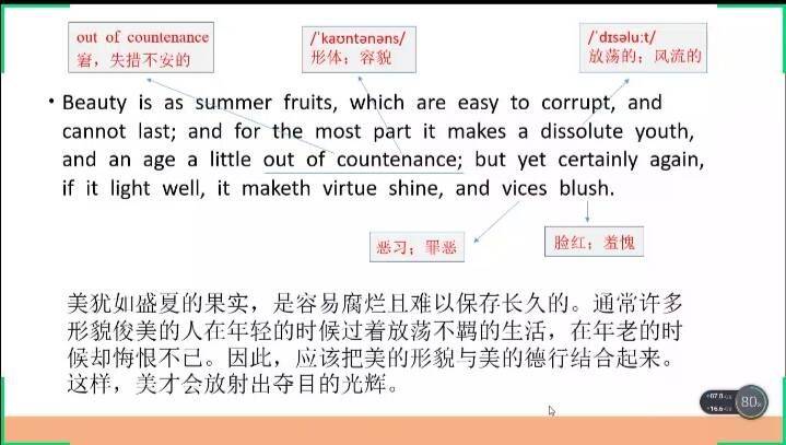 彭宁红分享了Francis Bacon培根的《Of Beauty》,彭宁红提出"究竟我们要追求怎样的美",来引导同学们产生对美的正确认识。通过观看短视频《一分钟了解弗朗西斯·培根》,大家对培根的思想有了进一步的了解,彭宁红对这篇语言简洁但蕴含丰富哲理的培根随笔《Of Beauty》进行了详细解读。她还分享了自己对这篇散文的读后思悟,“不必因外在缺陷而自忧自叹,而是要追求内在美的永恒”。她还让同学们多读书,读好书,用知识填充自己,增长智慧,才能变得越来越好,越来越美。