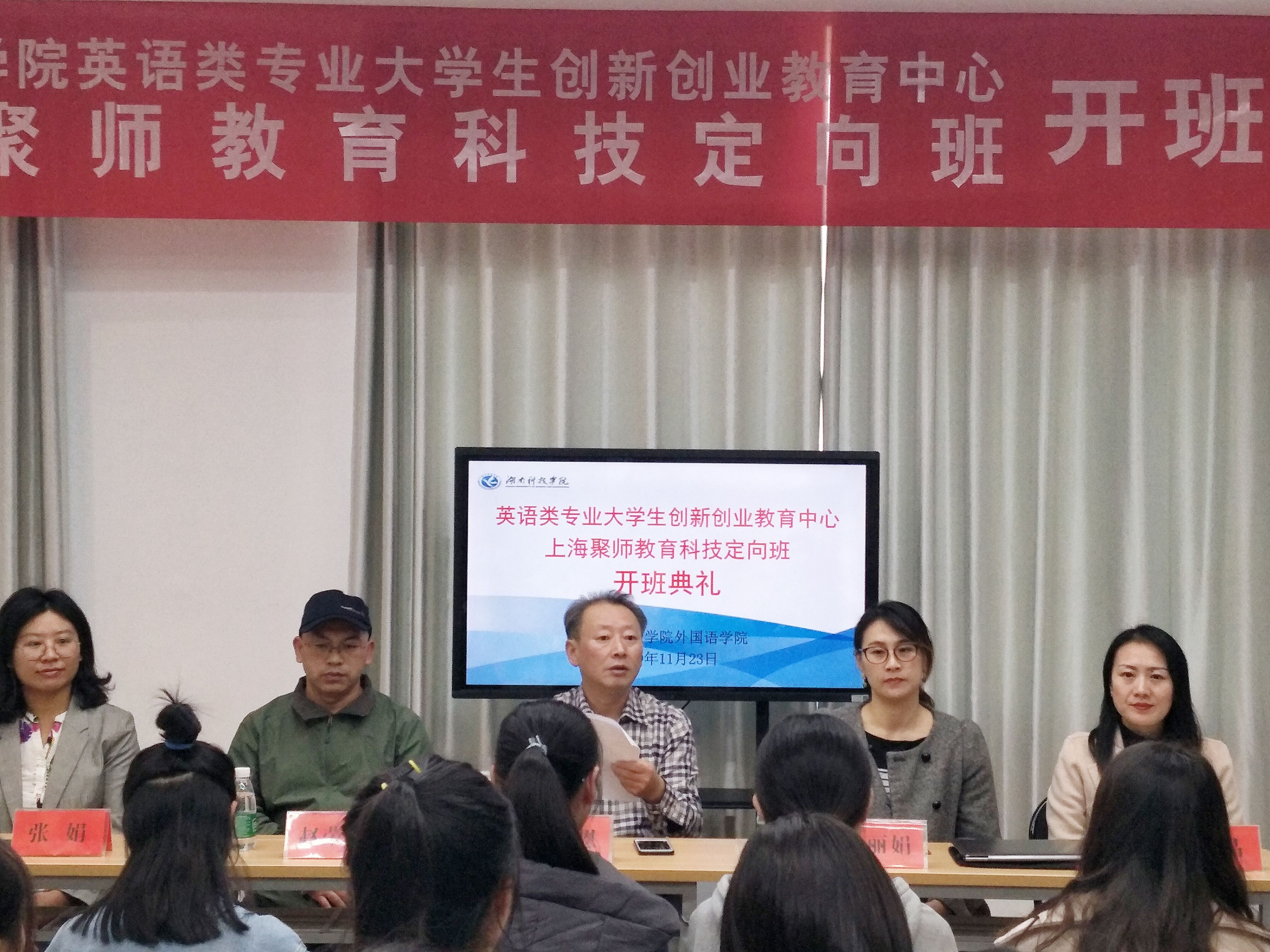 本网讯(通讯员:王梦渲)11月23日下午,伟德源自英国1946英语类专业大学生创新创业教育中心上海聚师教育科技定向班开班典礼在学校创新创业大楼317“聚师堂”校企合作工作室举行。出席本次活动的有上海聚师教育科技有限公司联合创始人谢丽娟、上海聚师教育科技有限公司培训经理张娟、外国语学院院长欧华恩教授和就业创业指导中心副主任赵荣。开班典礼由外国语学院党总支副书记罗晶主持,上海聚师教育科技定向班第一期42名学员共同参加此次开班典礼。