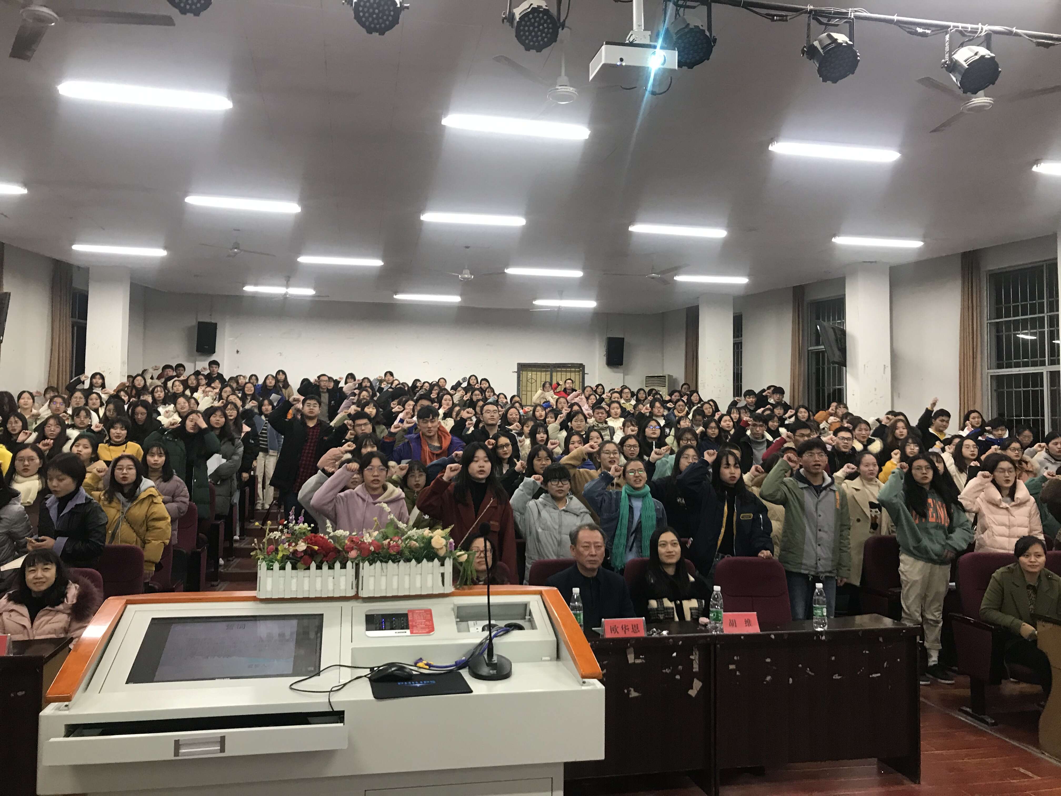 在主持人王素芳介绍完到场嘉宾后,欧华恩院长上台致辞。欧院长结合自身经历强调英语学习及专四证书的重要性,进一步介绍了英语专业就业形势和近几年外国语学院专四过级情况,并预祝同学们取得佳绩。进入现场答疑环节后,有位同学提出“面对专四不知道怎么调整心态”,欧院长针对此问题用诙谐幽默的语言进行了解答,现场掌声雷动。在17级专四成绩优异的同学发言后大会进入宣誓环节,全体学生信心倍增,立志奋战专四。