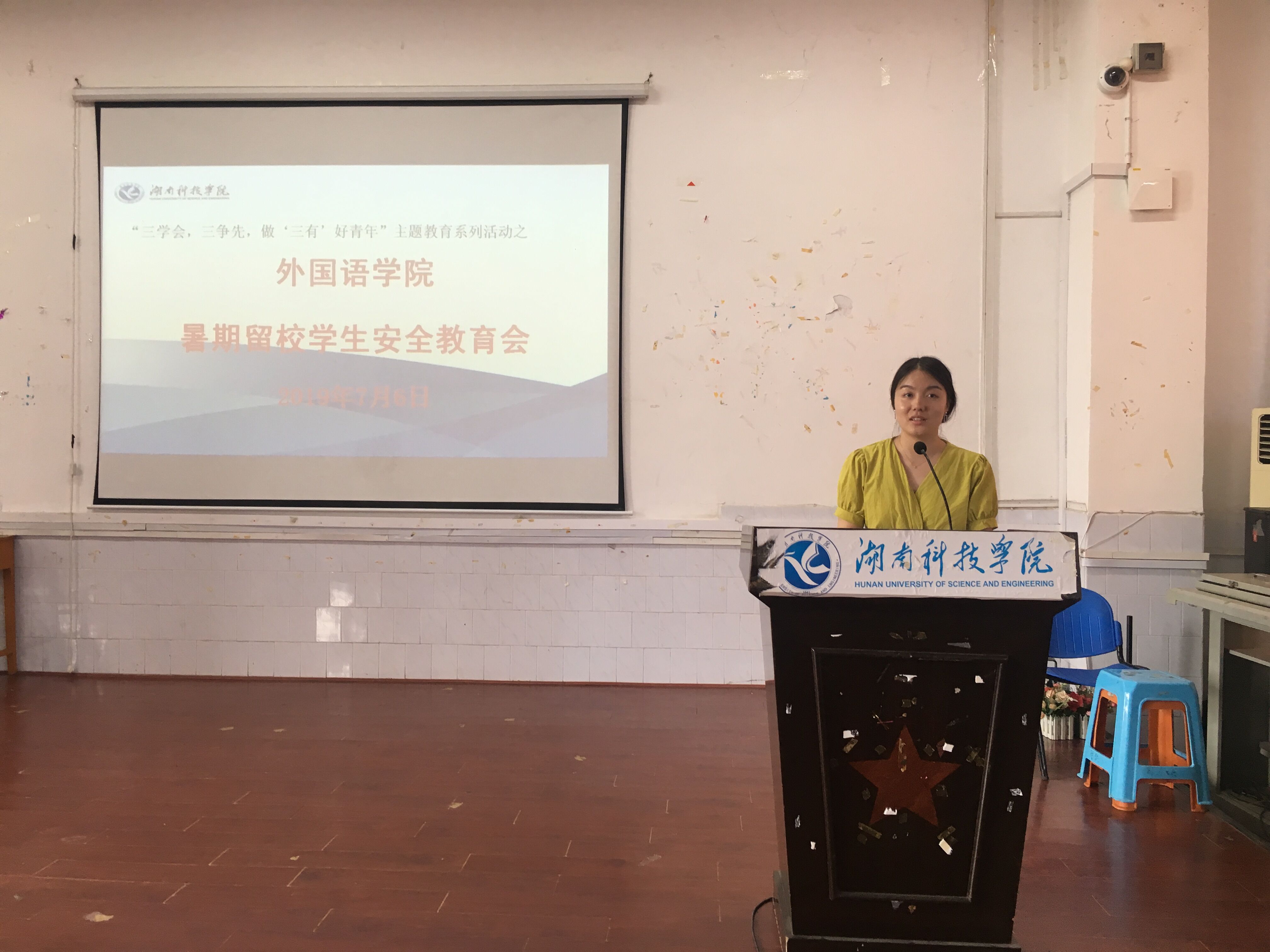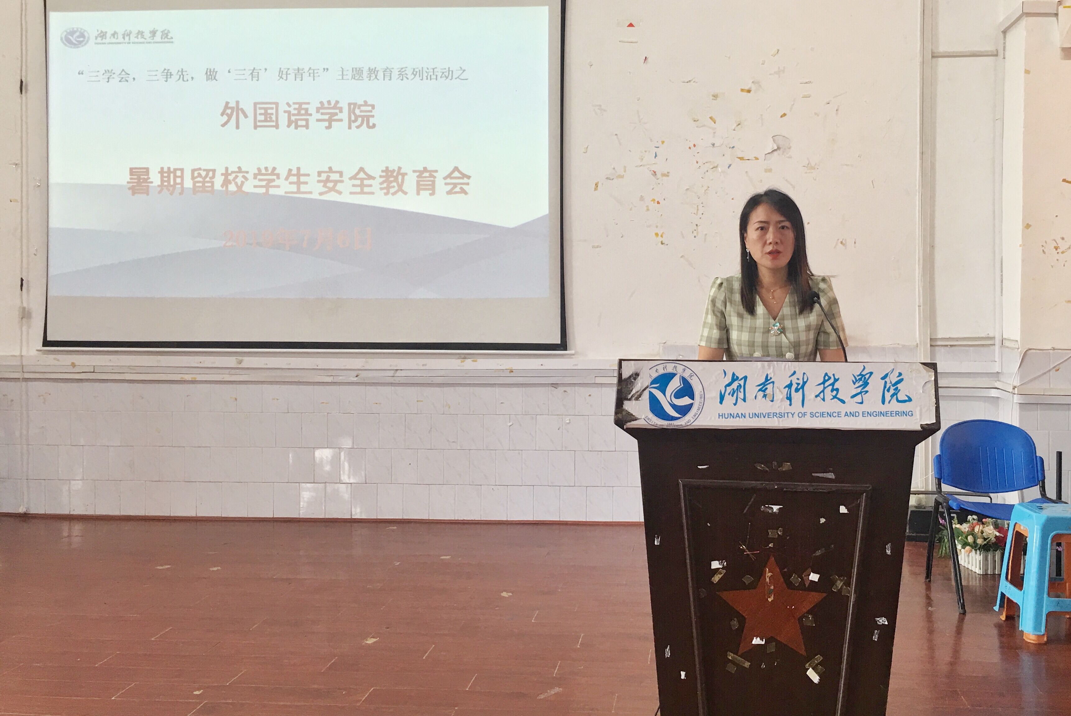 本网讯(通讯员 郑云华)为了做好暑期留校学生管理工作,保障留校学生安全,7月6日上午,外国语学院召开2019年暑期留校学生安全教育会。外国语学院党总支副书记、副院长罗晶,全体辅导员和全体留校同学到场参加。会议由18级辅导员王素芳主持。