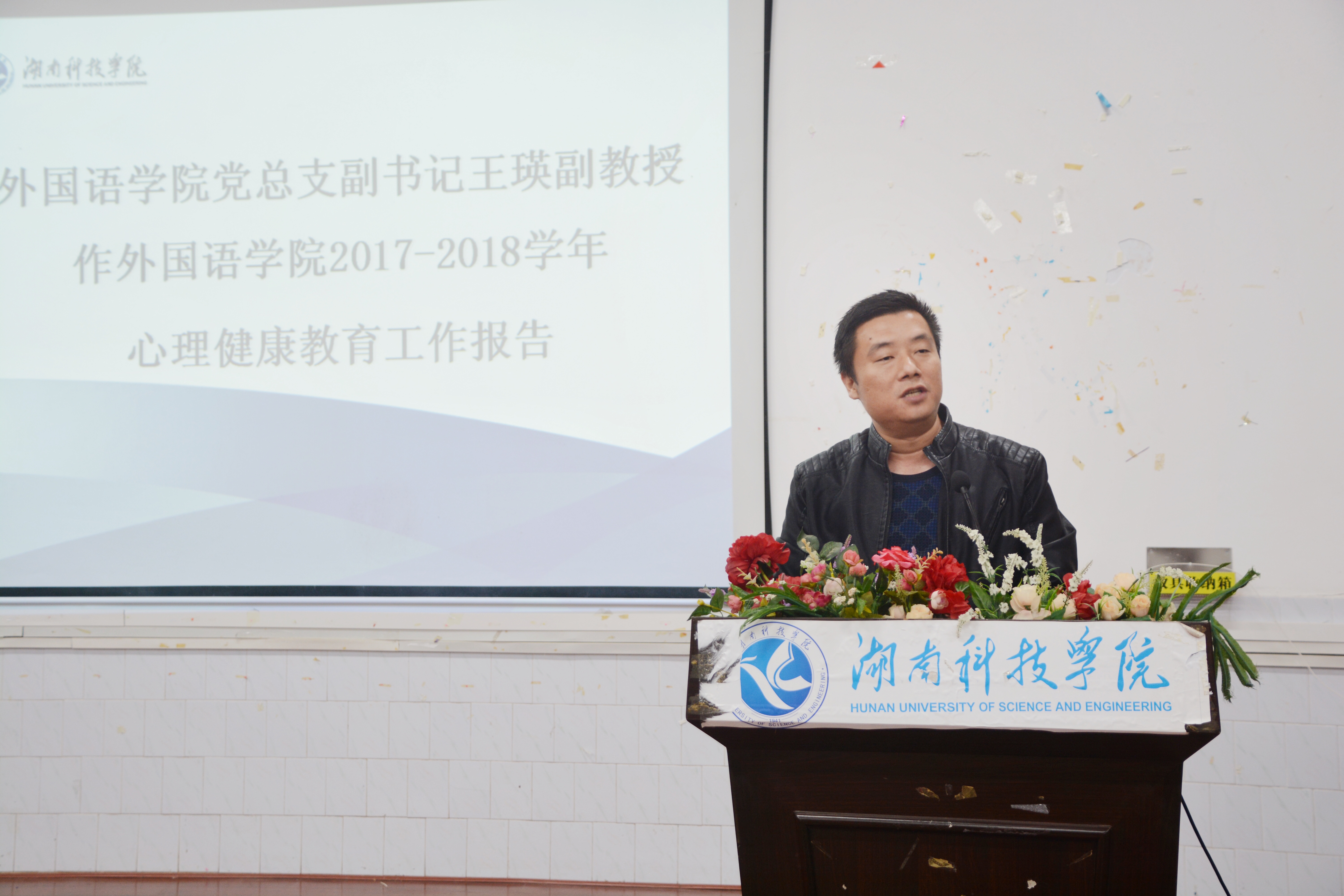 外国语学院党总支副书记王瑛在会上作学院2017-2018学年心理健康教育工作报告,报告的主题为“队伍合力是基础、品牌活动是保障、干预有效是关键”,在报告中,王瑛书记介绍了外国语学院女生多,心理状况复杂、学习压力普遍较大;男生人数虽少,但男生中存在的一些隐患和问题不能掉以轻心的院情,基于这样的院情,外国语学院始终坚持“宁可虚惊一场也不能麻痹大意”的工作指导思想,从提升队伍合力、打造品牌活动、干预及时有效等三方面入手,化解了矛盾、消除了隐患,全力促进学生健康快乐成长。