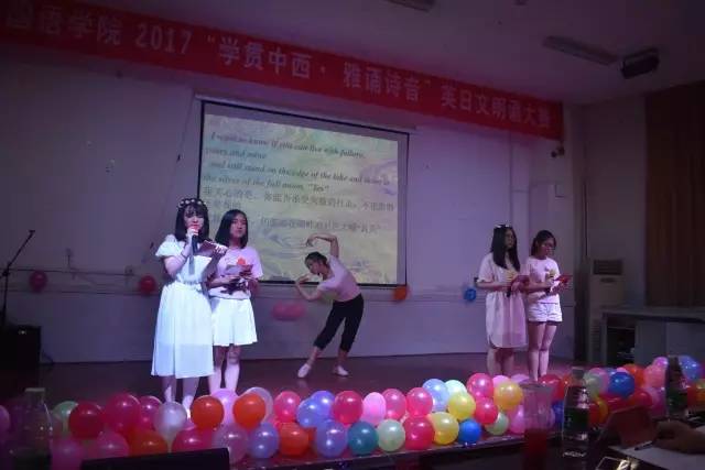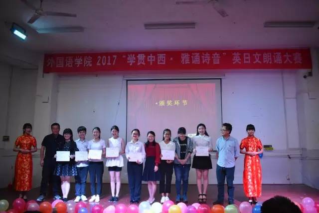 在本次比赛中,各组选手不仅展现了高超的专业水平,而且充分发挥创新精神,在传统朗诵的形式上融入了舞蹈、歌曲等新的元素,让比赛更加精彩。其中来自英语1605班的李家琪组深情并茂的朗诵了《Think it over》,赢得了全场观众的掌声,而英语1502班全体的合诵则把比赛气氛推向了高潮。 这次比赛旨在强化学生所学英日文知识,扩展学生知识面,锻炼学生口语能力。