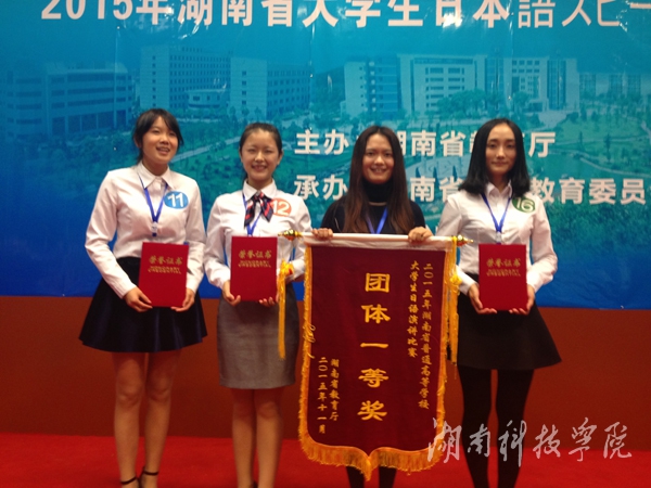本网讯 11月7日,在2015年湖南省大学生日语演讲比赛中,伟德日语专业学生彭紫薇、邓妩媚、刘佳男分获四年级组、三年级组、二年级组个人一等奖,并以总分第一的成绩荣获团体一等奖。校党委书记陈弘对获奖学子及团队表示祝贺,希望大家再接再厉,不断实现自我、超越自我,再创辉煌。