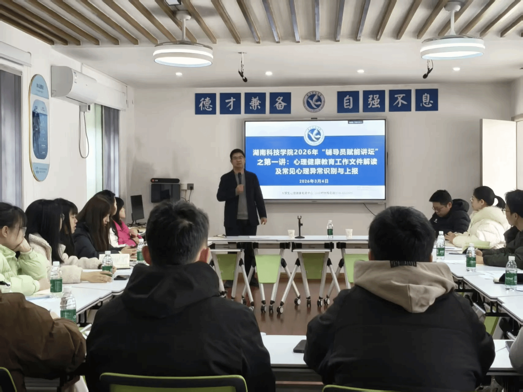 (编辑:颜钰轩 刘依萱 罗淑雅)为深入贯彻“健康第一”教育理念,培养新进辅导员心理育人专业能力,搭建全员育心体系。3月4日,学校2026年“健康第一,赋能启航”辅导员赋能讲坛之新进辅导员心理知识专项培训在大学生心理健康中心智慧教室正式开讲,心理中心所有老师参加,学工部副部长王君出席本次会议,2025年新入职辅导员全员参训。第一讲由心理中心主任涂巍主讲,内容涵盖心理健康教育工作文件的解读以及常见心理异常识别与上报。