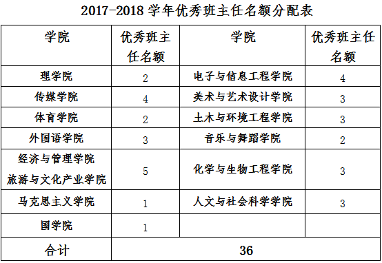 2、优秀辅导员的推荐名额10人;优秀班主任的推荐名额36人(各院名额见分配表);