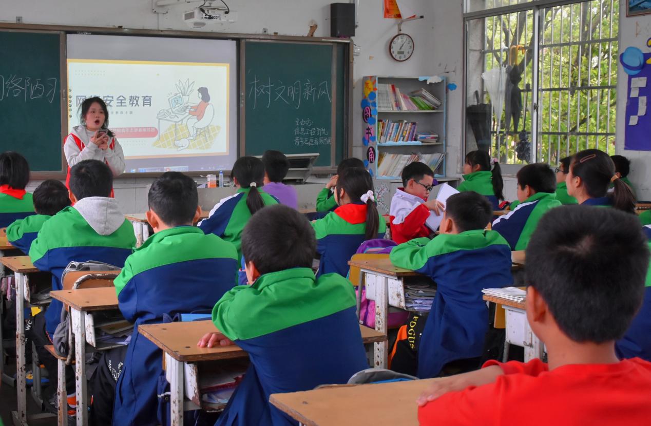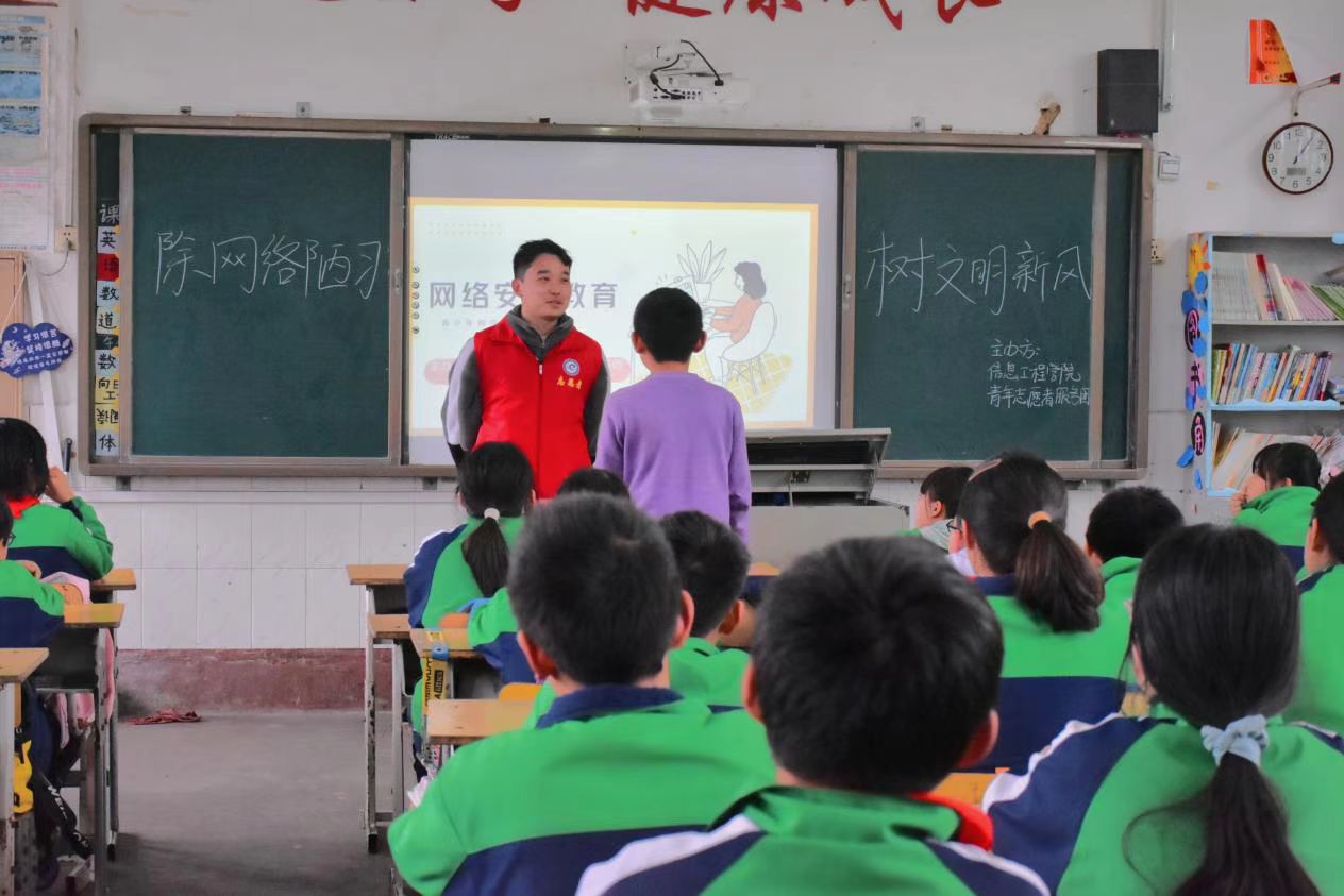 本网讯(通讯员 李玉娇 刘兵兵) 为了普及中小学生信息网络安全知识,营造良好的网络氛围,加快建设网络强国。我院青年志愿者服务团于3月24日走进杨梓塘小学举行“乡村信息技术课堂”活动,为六年级的小朋友上了一堂信息安全课。